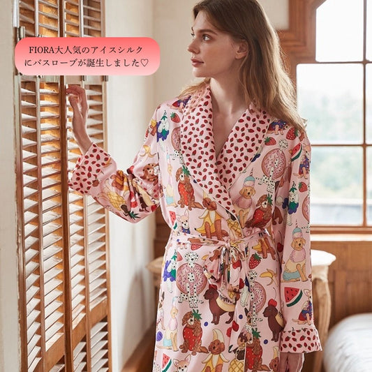 【先行発売開始】2025秋冬新作 🎃ホットシルク ガウン バスローブ 裏地ベロア わんチャン柄 襟イチゴ柄 パジャマ ルームウェア