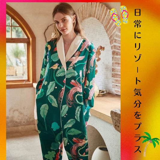 【先行発売開始】2025秋冬新作 🎃ホットシルク 裏地ベロア グリーン オウム&植物柄 長袖 長ズボン パジャマ ルームウェア