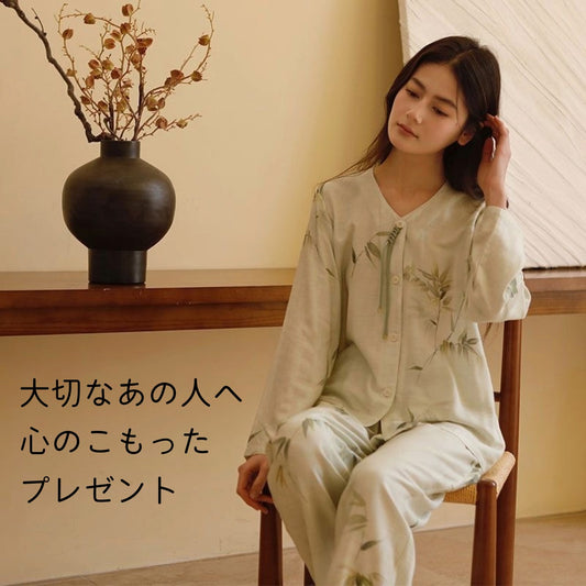 竹布🎋TAKEFU【日本製】 翡翠カラー 竹柄 2025秋冬新作 長袖 長ズボン 襟なし パジャマ ルームウェア