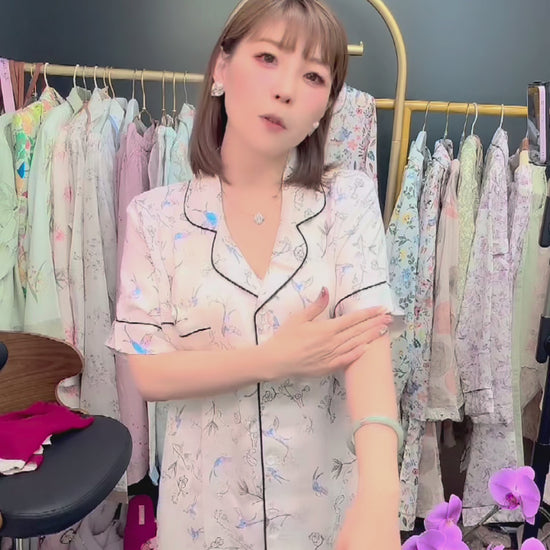 【FIORA】綿サテン 極艶 ブルー野鳥柄 半袖 長ズボン パジャマ ルームウェア レディース