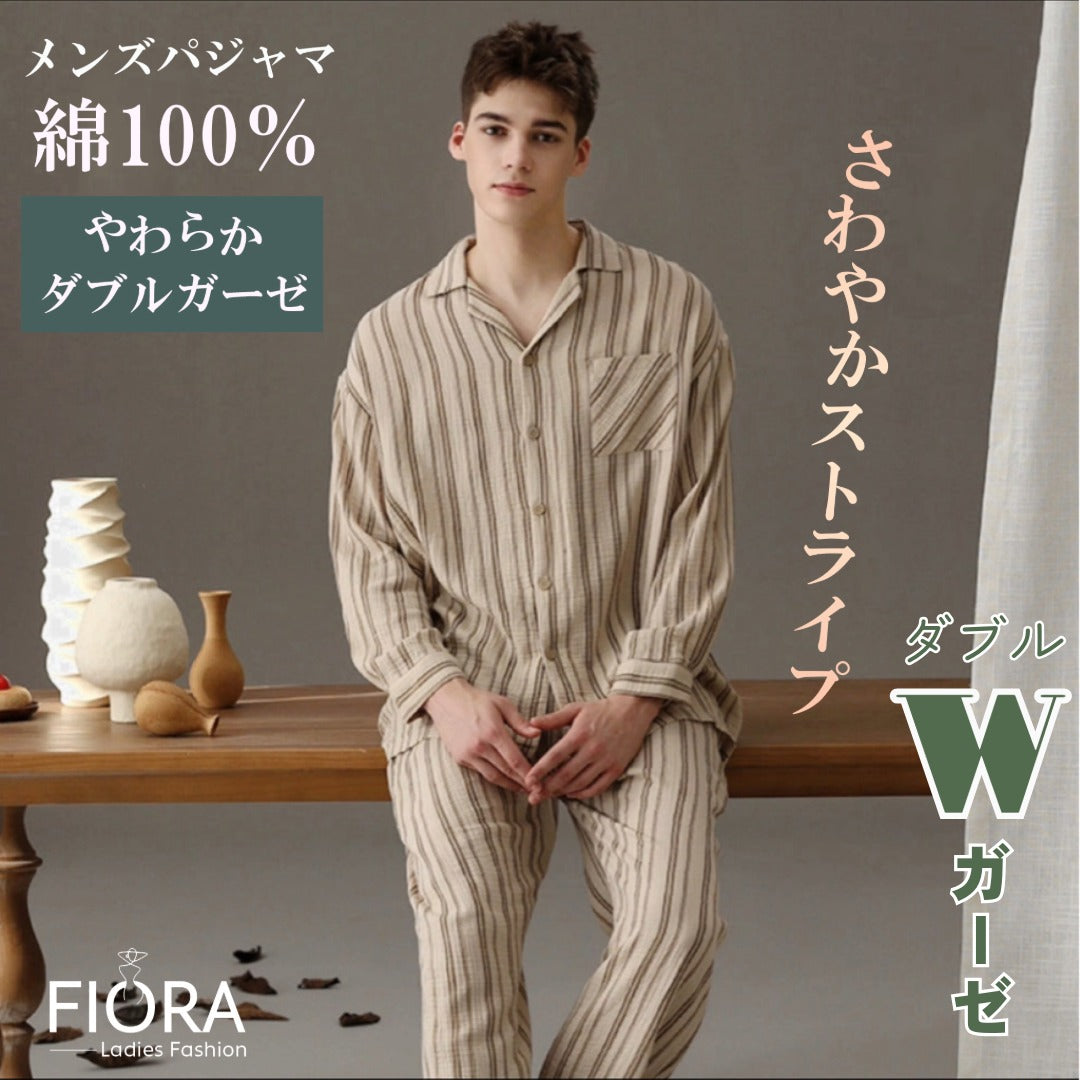 WダブルガーゼW【日本製】2025年新作 メンズパジャマ ストライプ柄 ペアセット パジャマ ルームウェア コットン100% 長袖 長ズボン