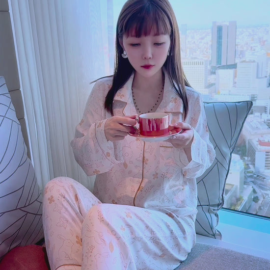 綿サテン 【日本製】 オレンジ うさぎ柄 長袖 長ズボン パジャマ ルームウェア