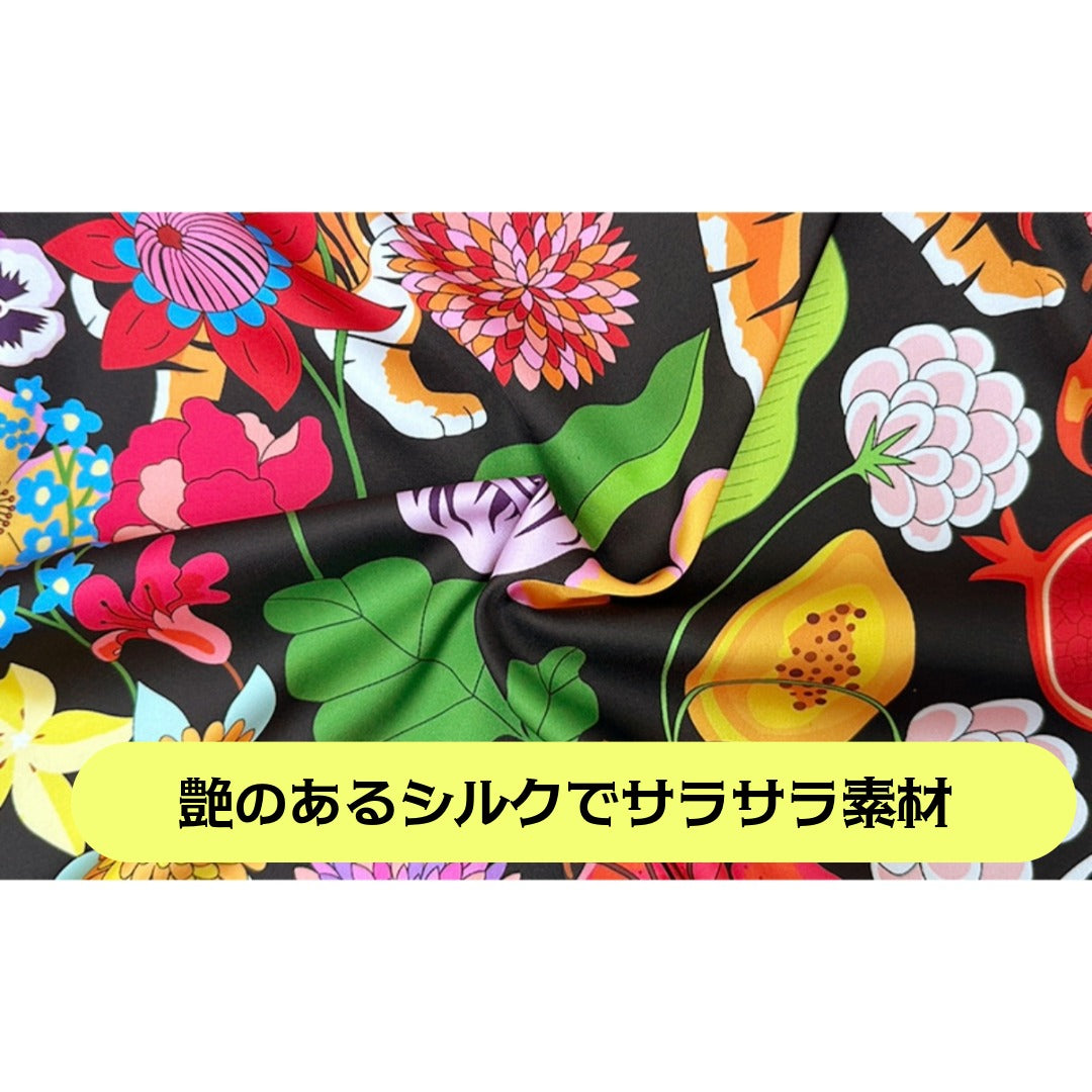 ◆鮮やかなフラワープリントが、まるで夜空に咲く花火のよう。アイスシルクの光沢が柄に奥行きを与え、裏地ベロアのぬくもりが優雅さを引き立てます。