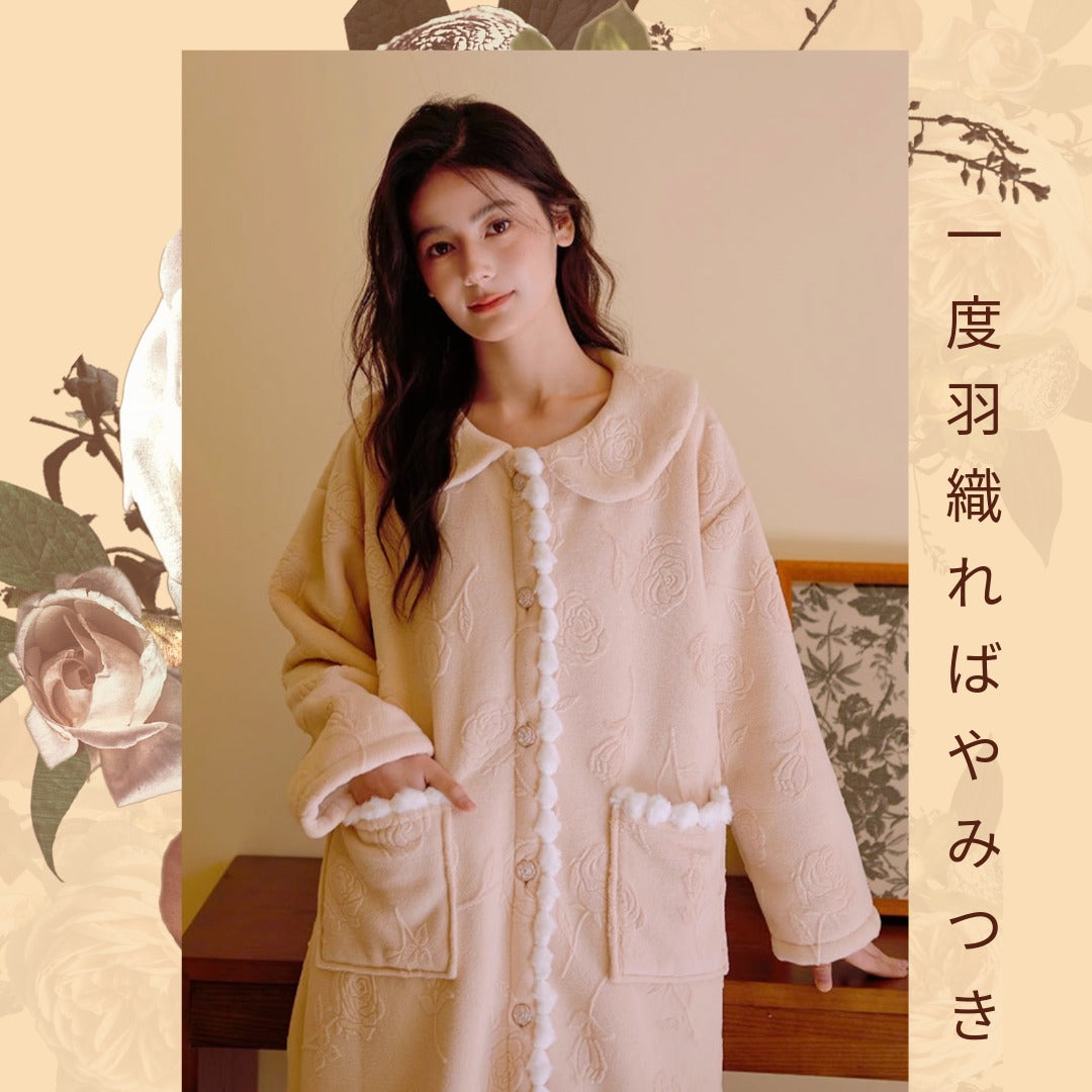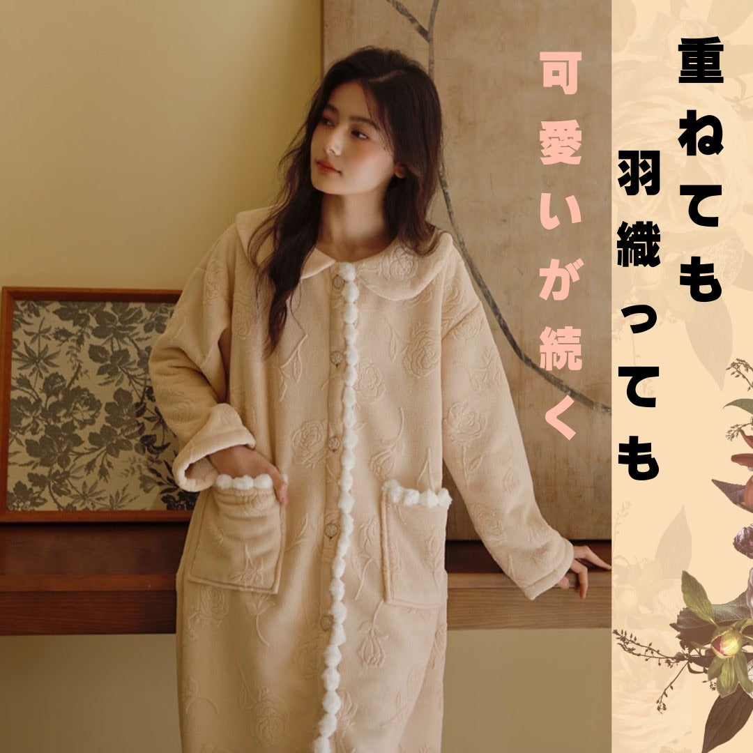 【秋冬物発売開始!!】2025 冬新作❄️日本製❤️モコモコルームウェア ベージュ バラ 羽織り ワンピーススタイル