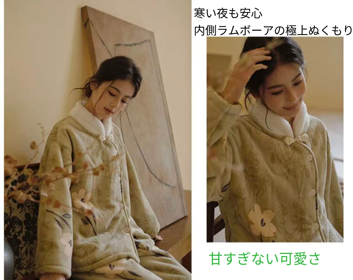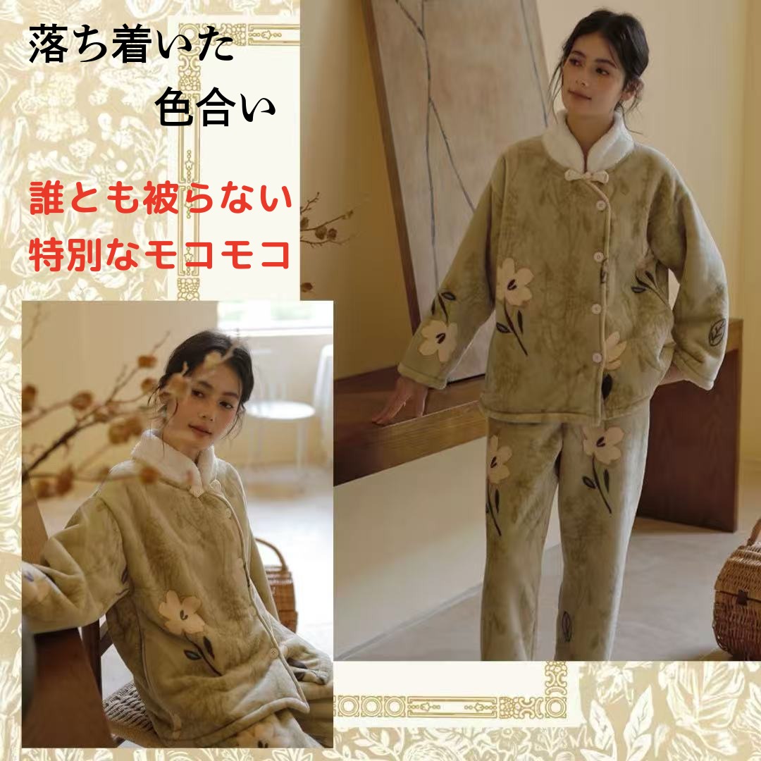 【秋冬物発売開始!!】 2025 冬新作❄️日本製❤️モコモコルームウェア グリーン お花 上下セット