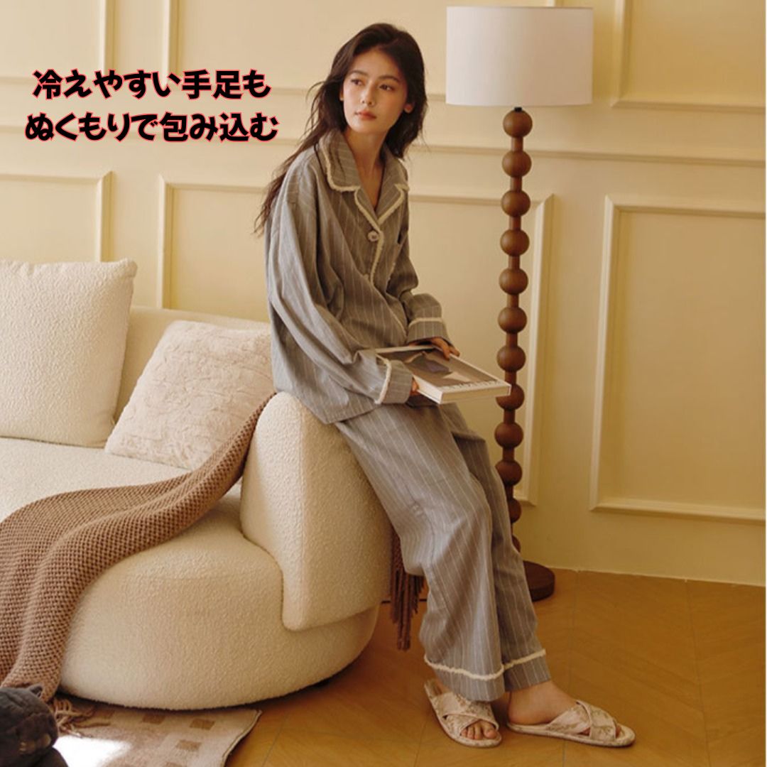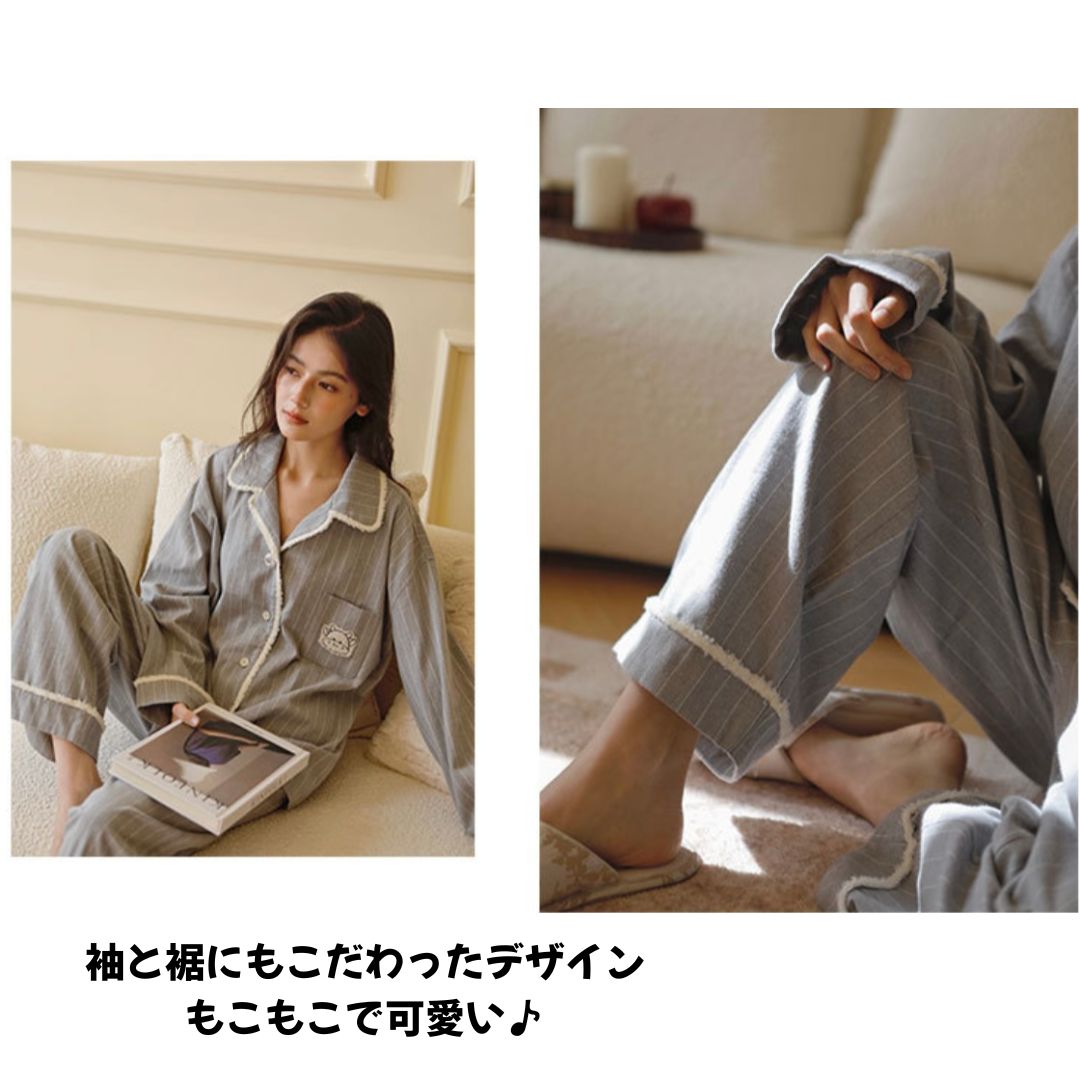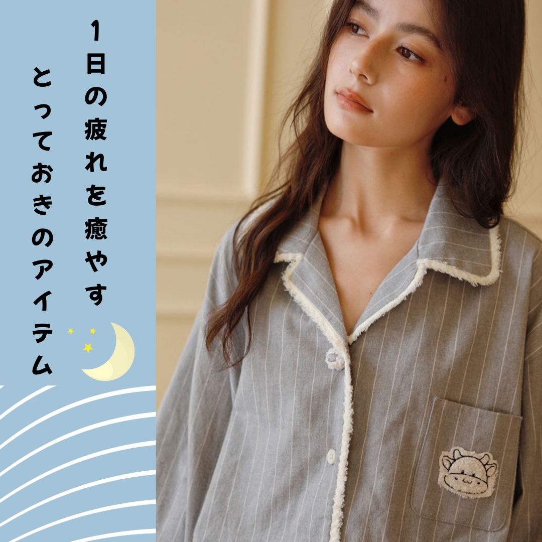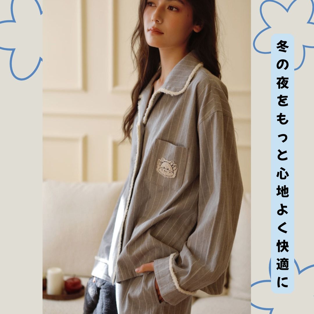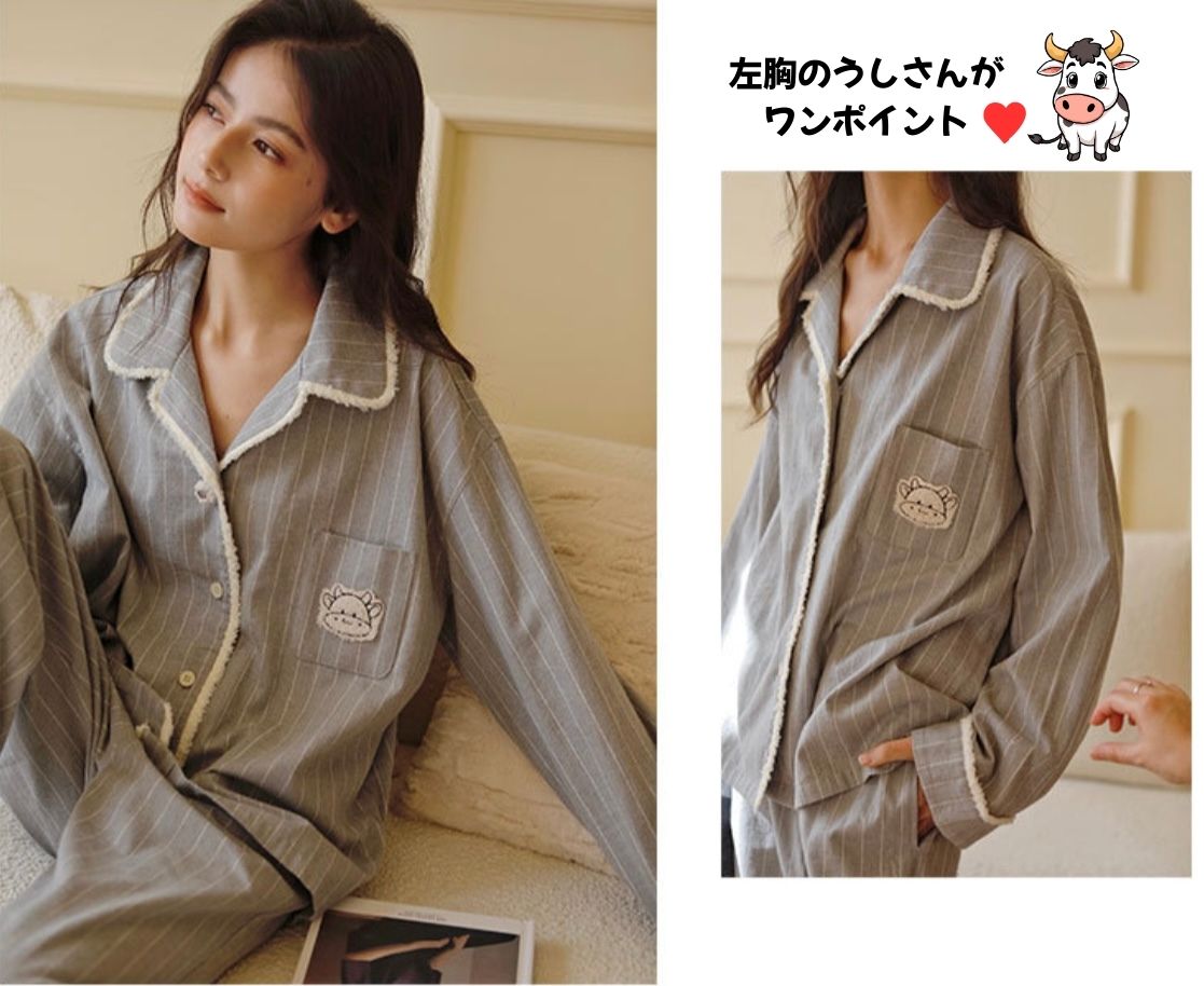 ◆シンプルデザインの中にもポケットに刺繍されたウシさんが可愛さと機能性を両立した冬の定番パジャマです。