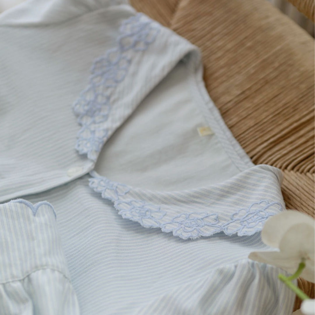 ◆パステル×ストライプ柄、襟元の刺繍、袖口、女の子の「可愛い」を詰め合わせたデザイン。