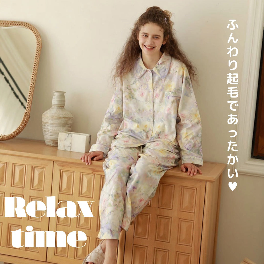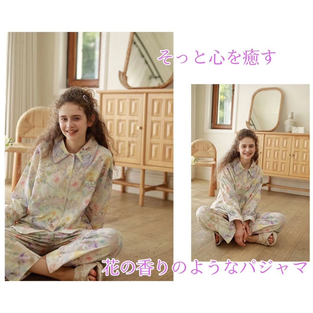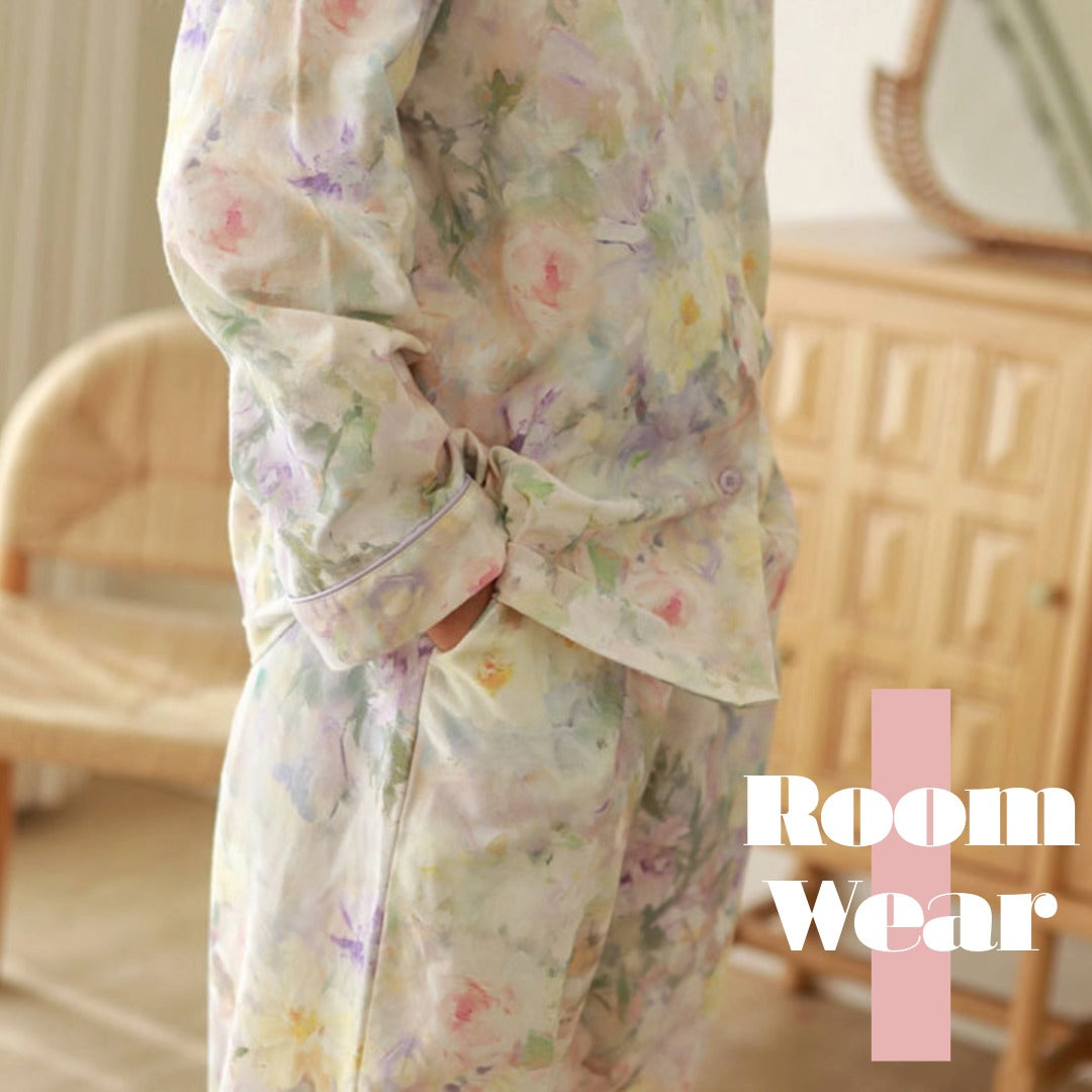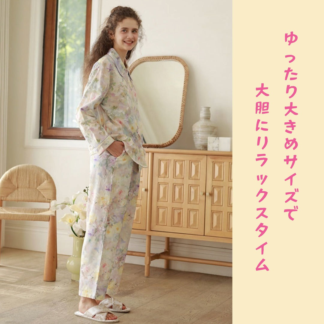 ◆キャンパスに描かれたようなパステルフラワーデザインが上品で可愛いらしいルームウェアが発売開始されました。ゆったりとした大きめなサイズ感のため幅広い年齢層の方にお選びいただけます。