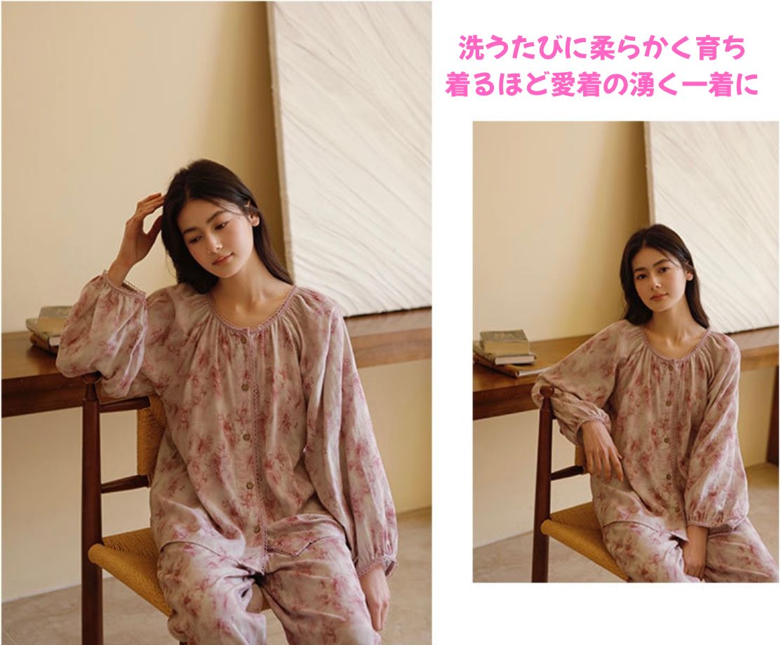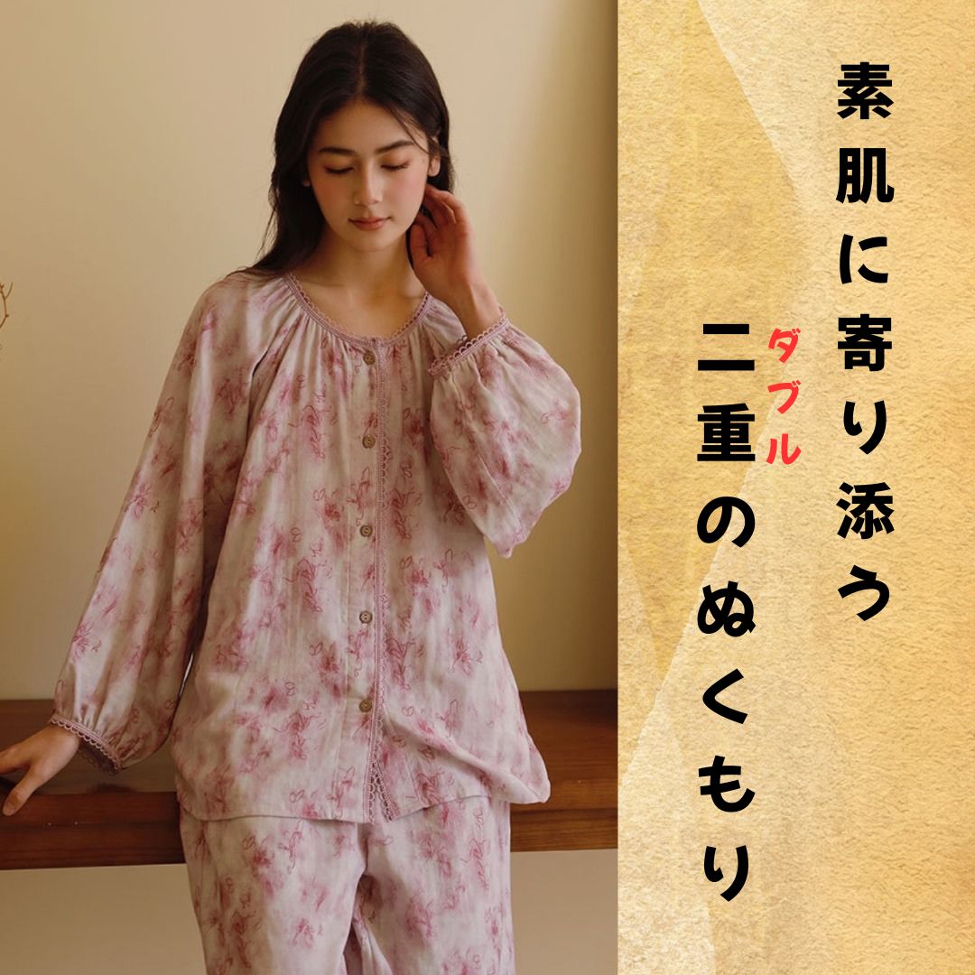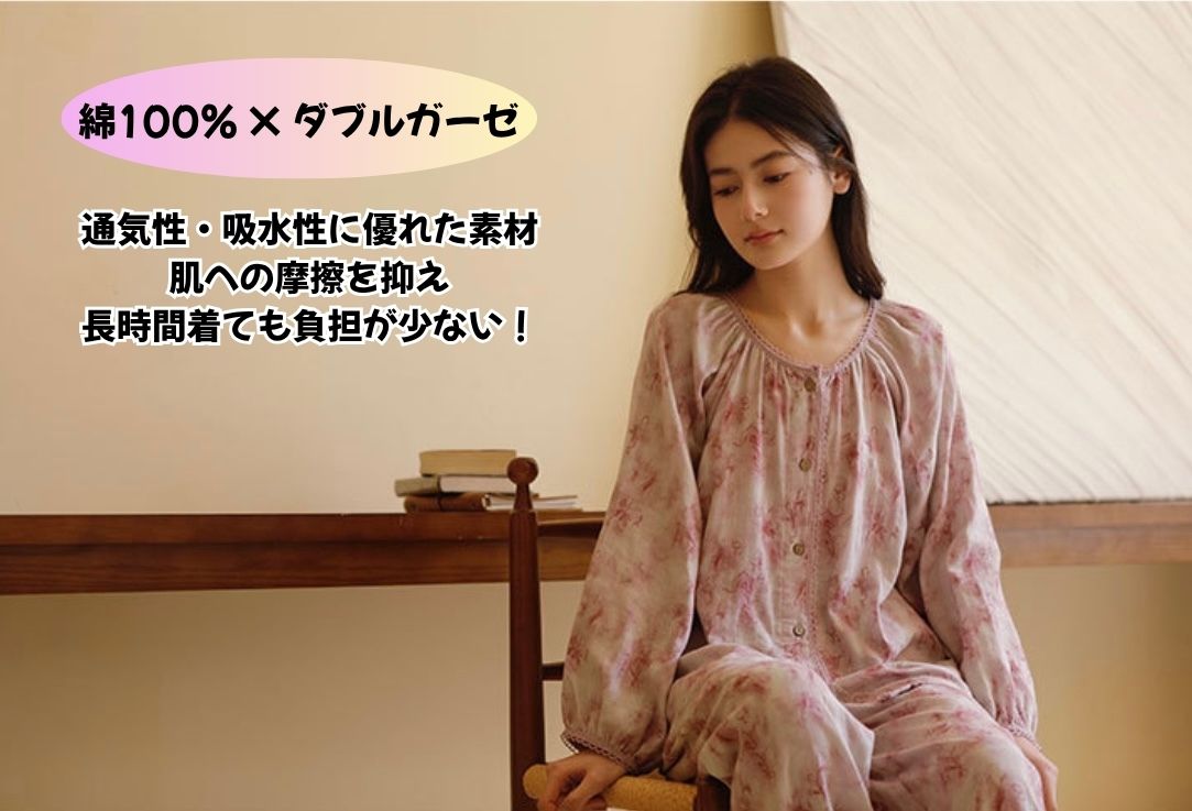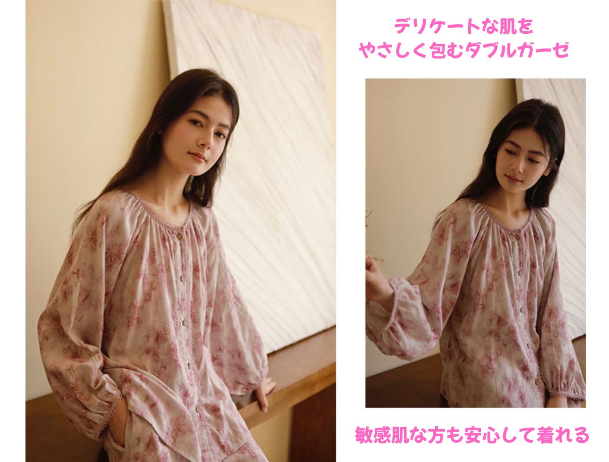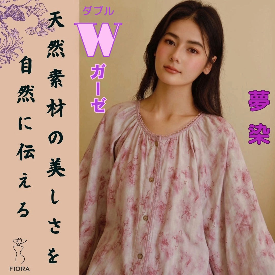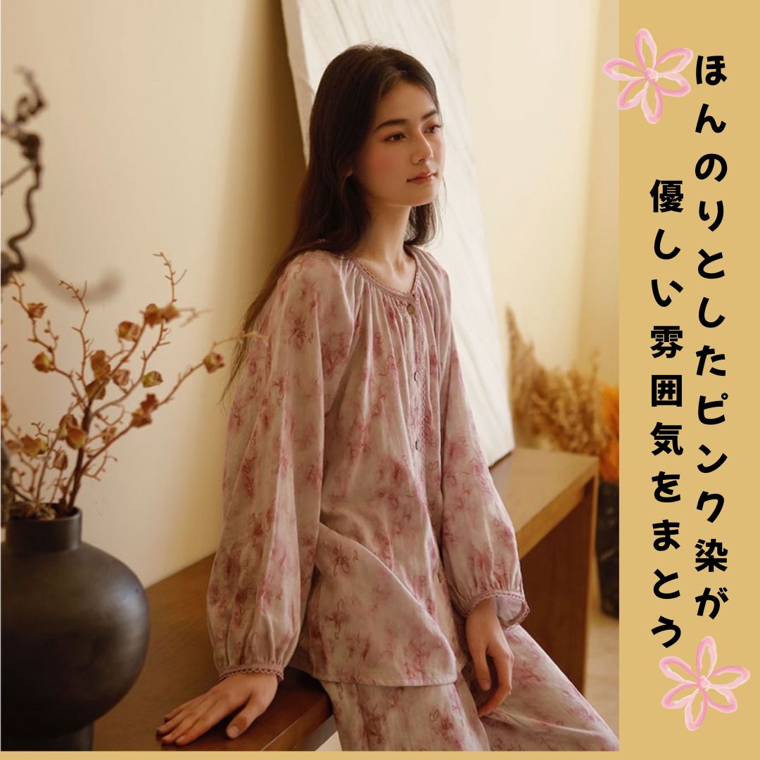 WダブルガーゼW【日本製】2025新作 ピンク染め 長袖 長ズボン 襟なし パジャマ ルームウェア
