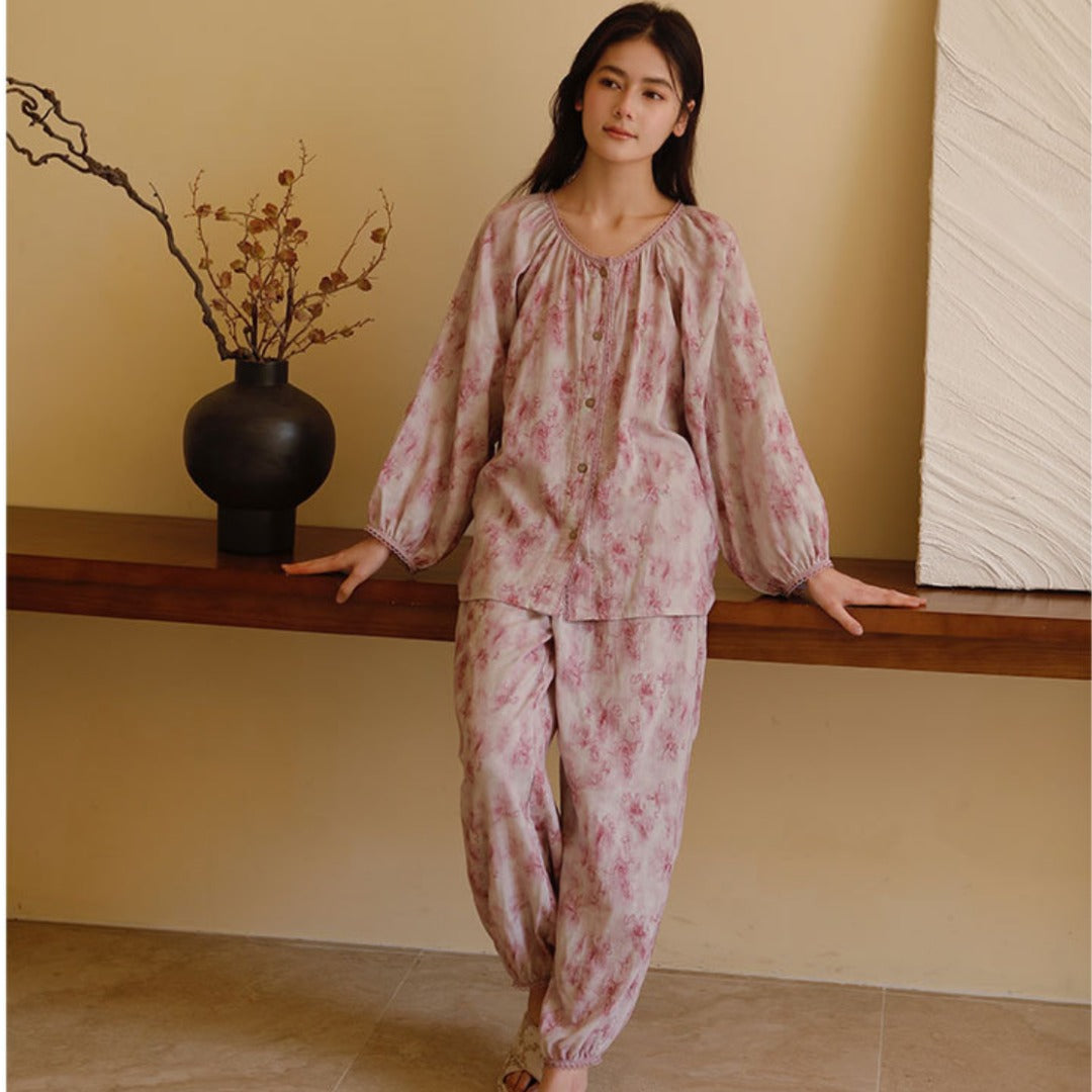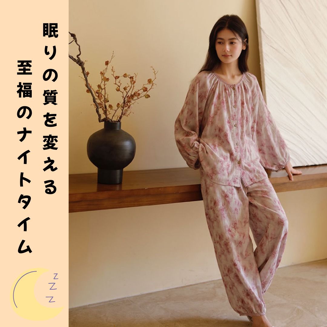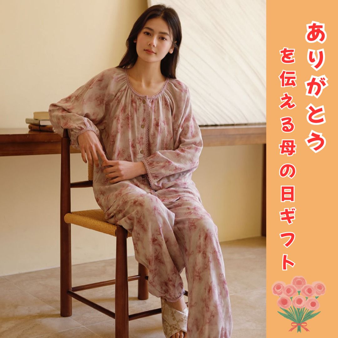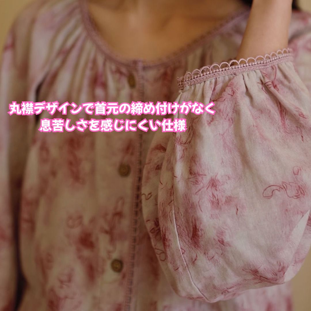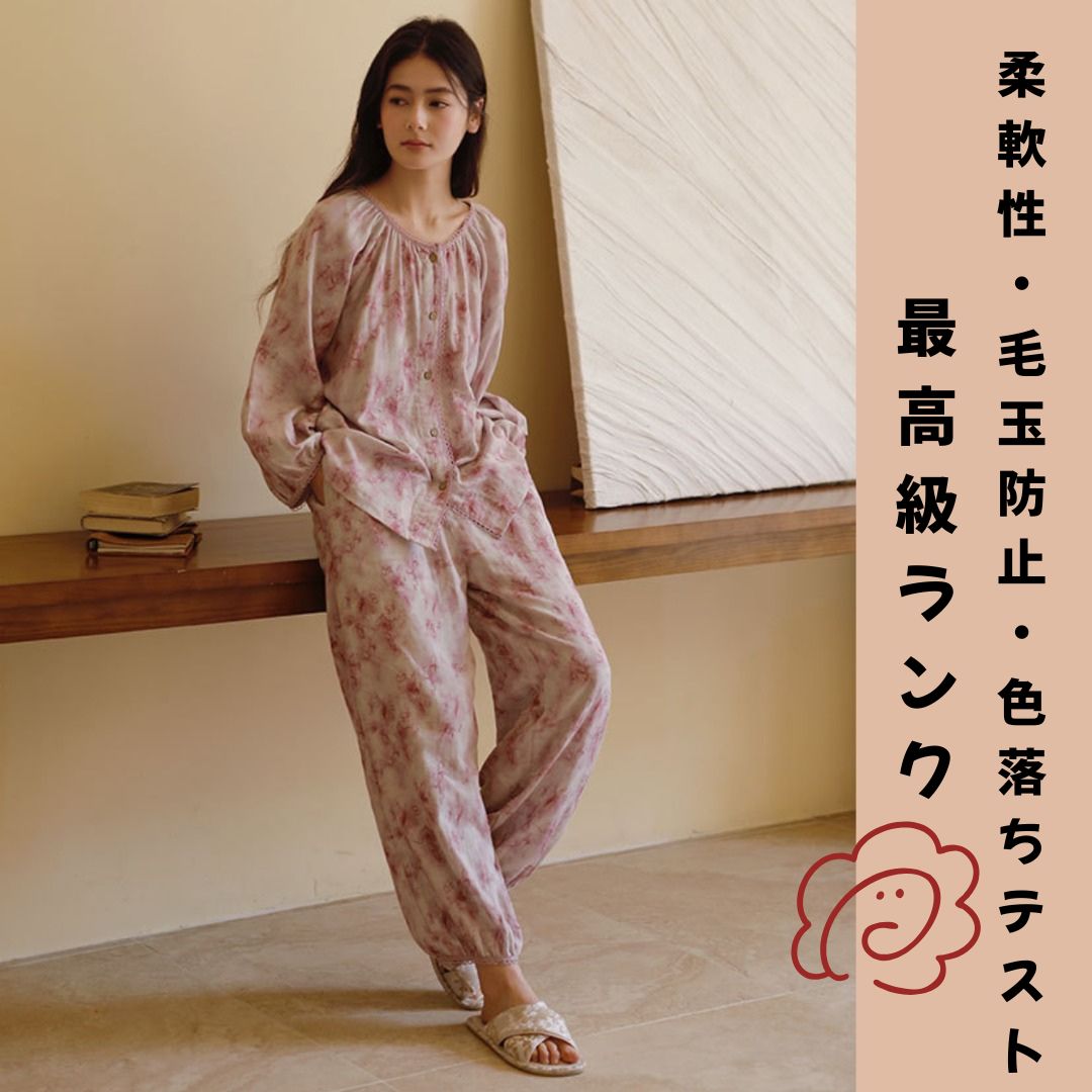 WダブルガーゼW【日本製】2025新作 ピンク染め 長袖 長ズボン 襟なし パジャマ ルームウェア