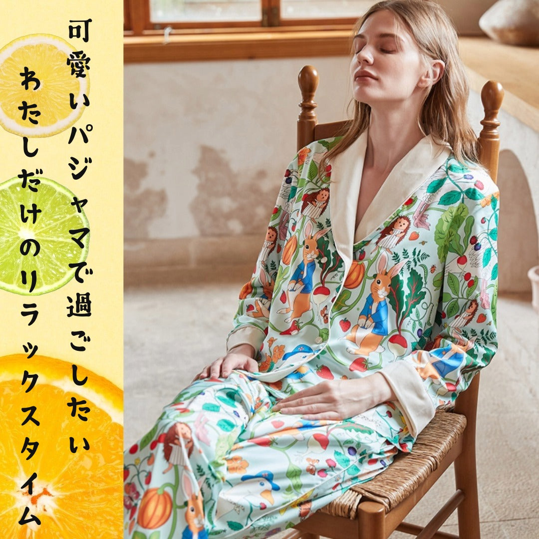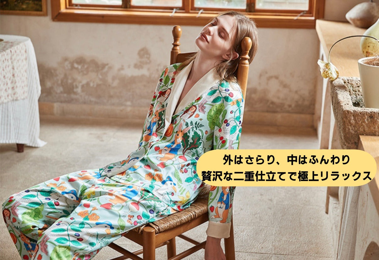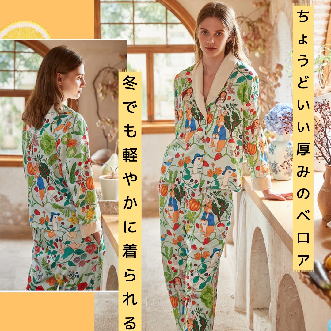 【先行発売開始】2025秋冬新作 🎃ホットシルク 裏地ベロア ハリネズミ&うさぎ柄 長袖 長ズボン パジャマ ルームウェア