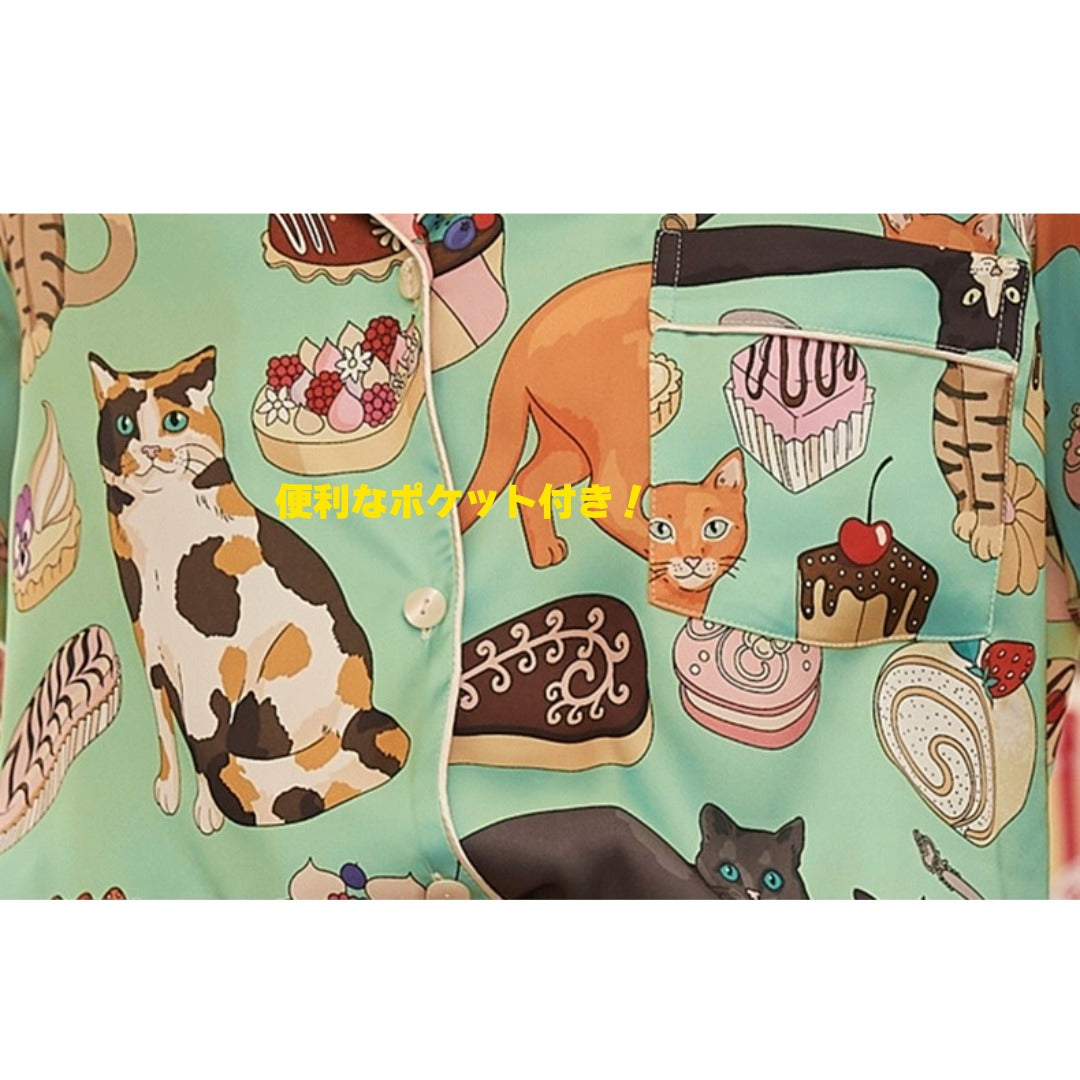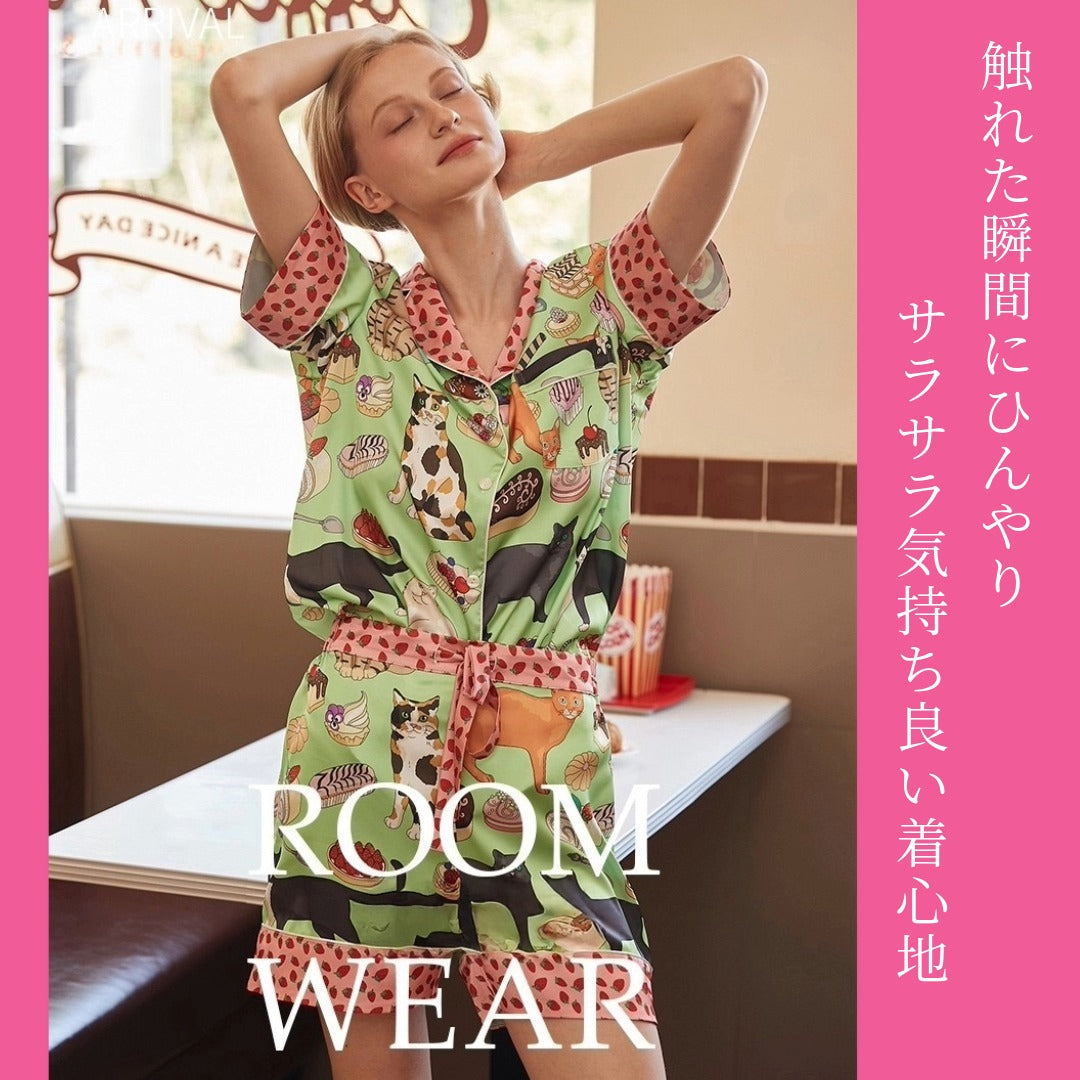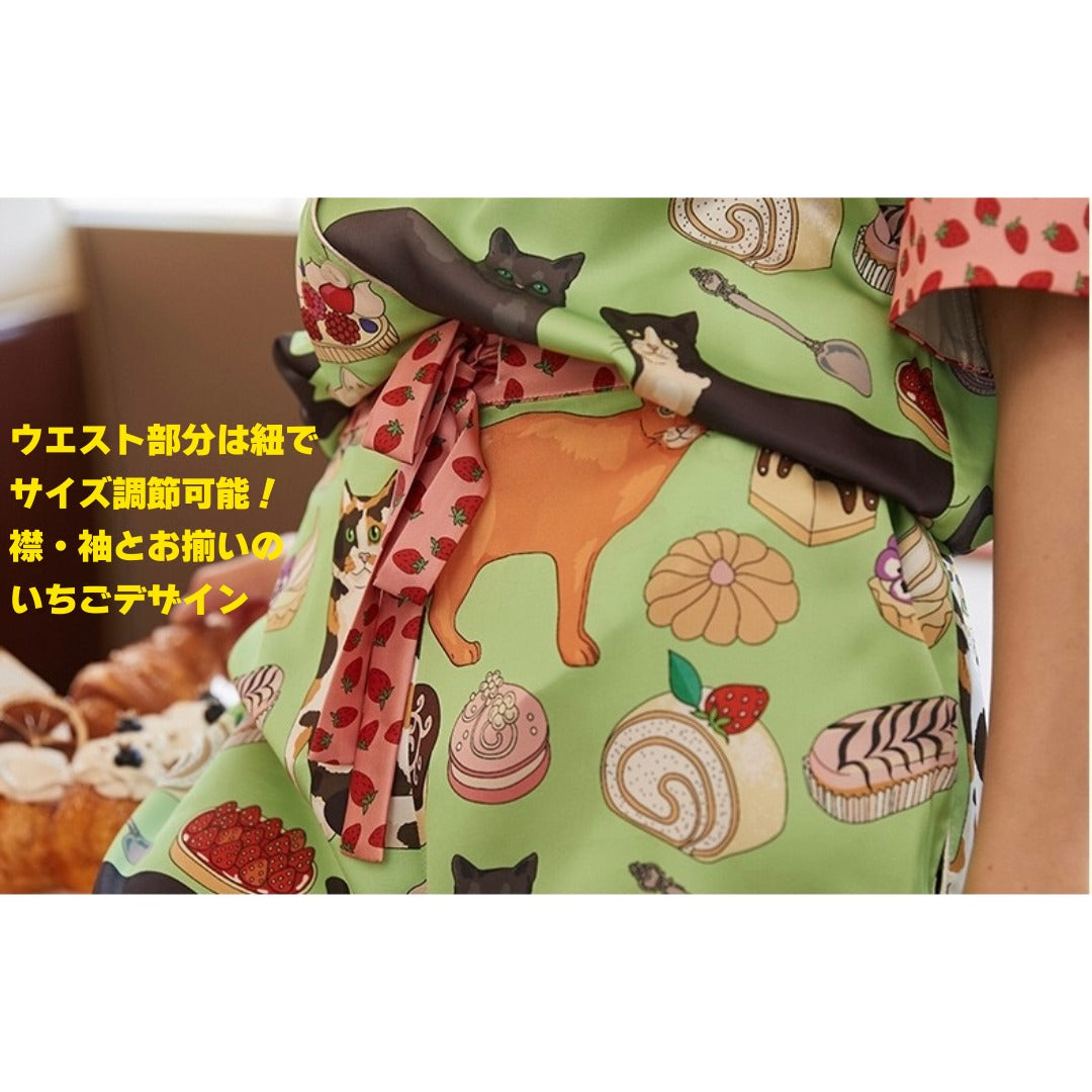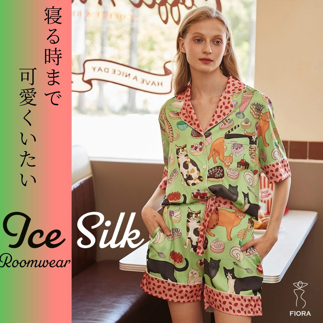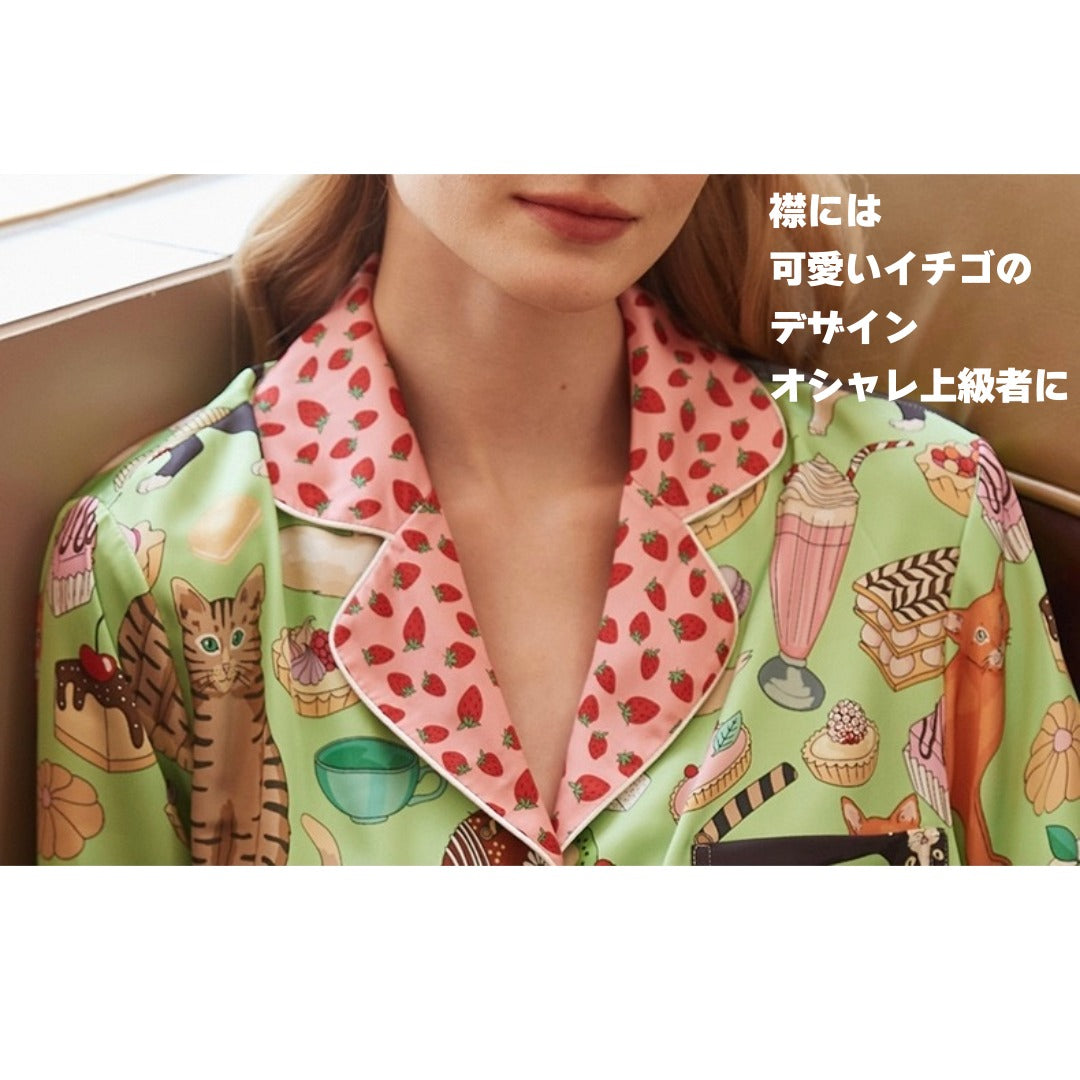 2026新作 🌻アイスシルク ライトグリーン 猫&スイーツ柄 襟イチゴ柄 半袖 半ズボン パジャマ ルームウェア