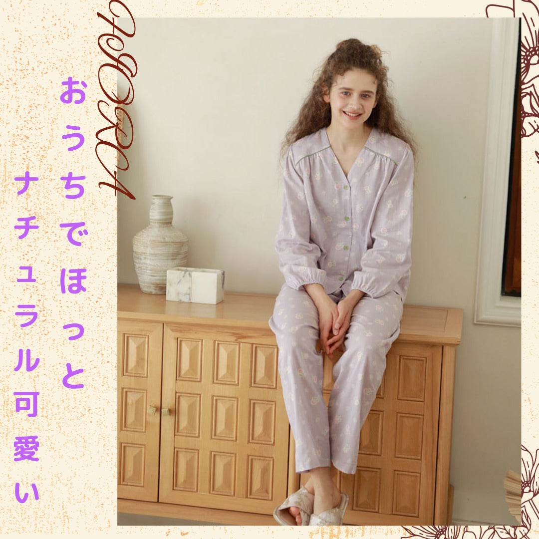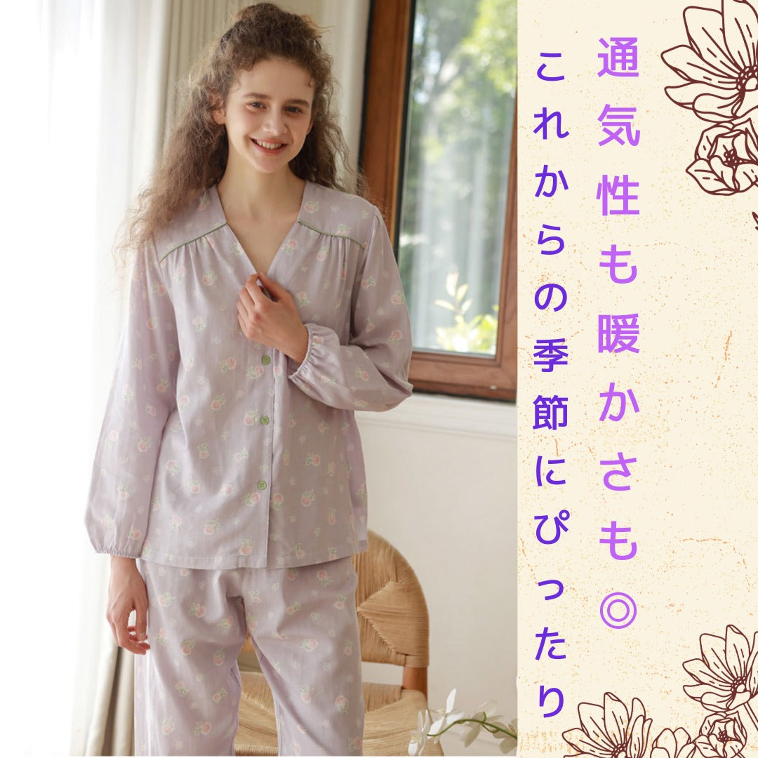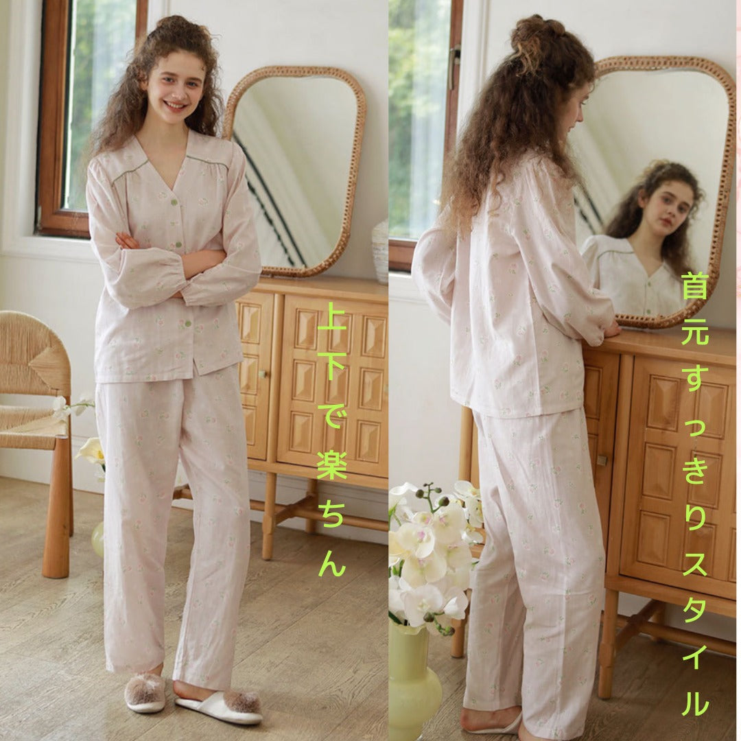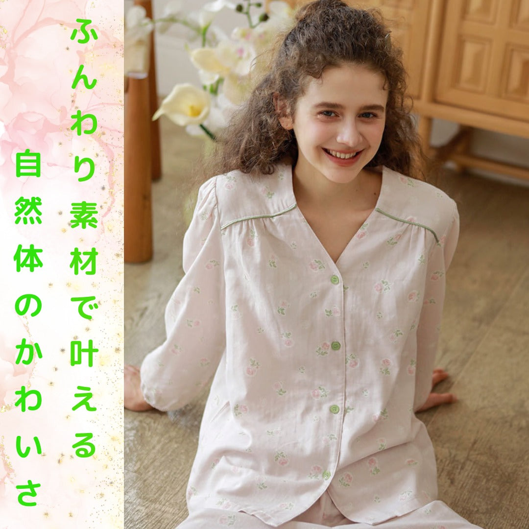 WダブルガーゼW【日本製】2025新作 フェミニンローズ 2色 長袖 長ズボン V開き 襟なし パジャマ ルームウェア
