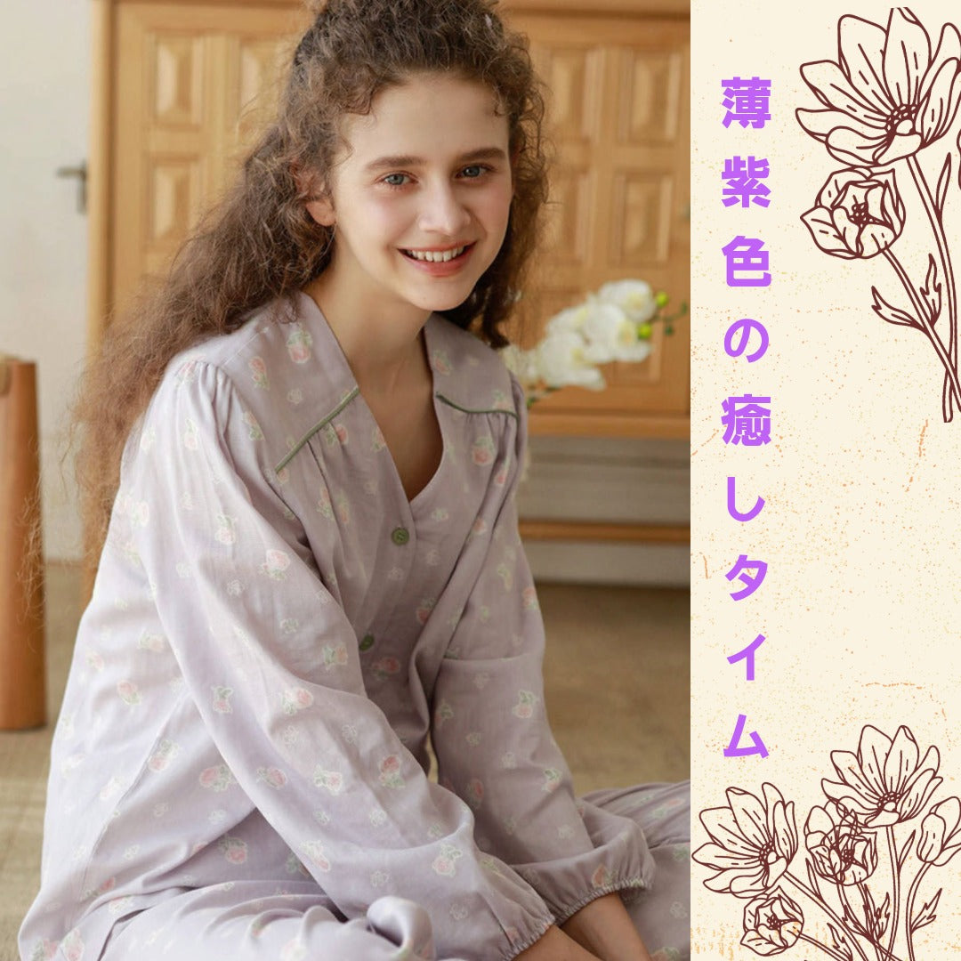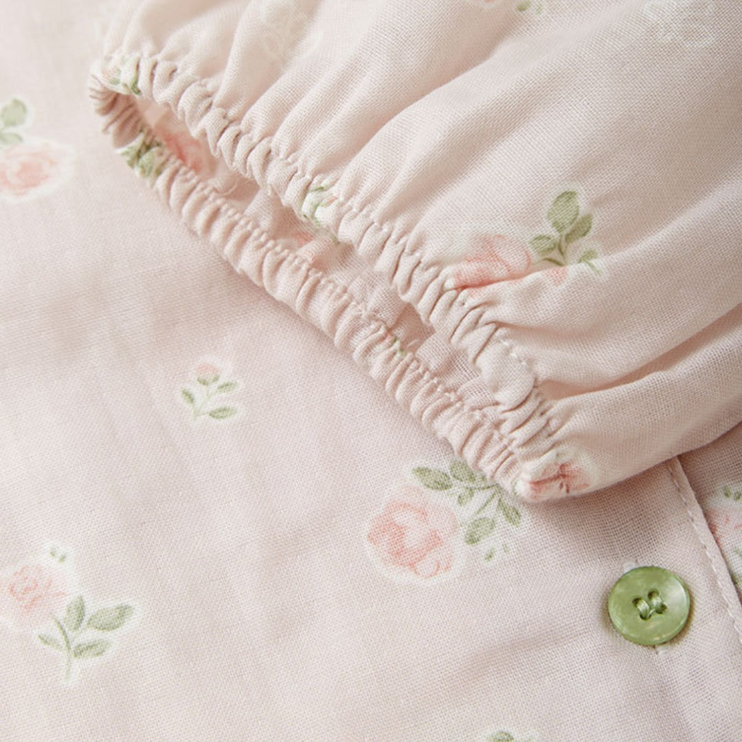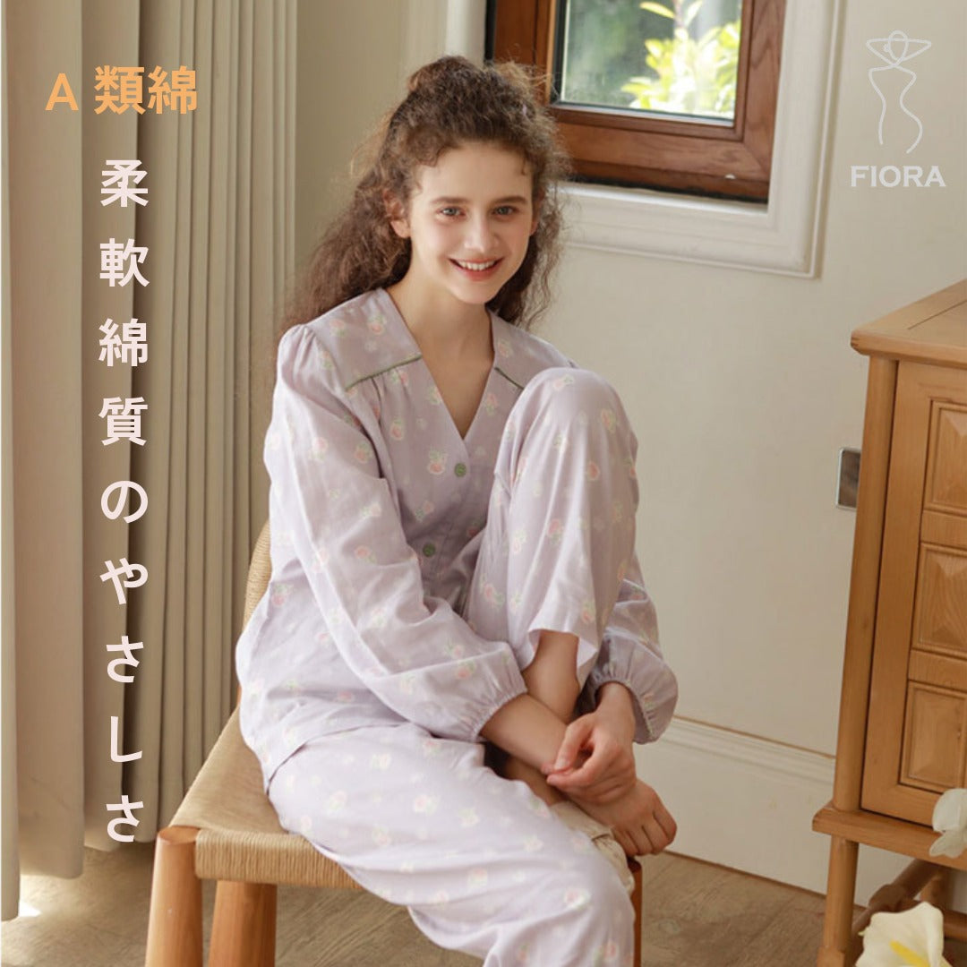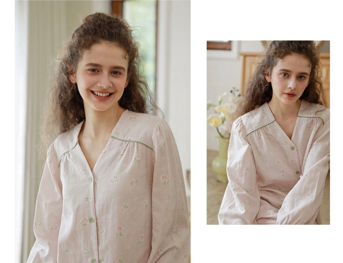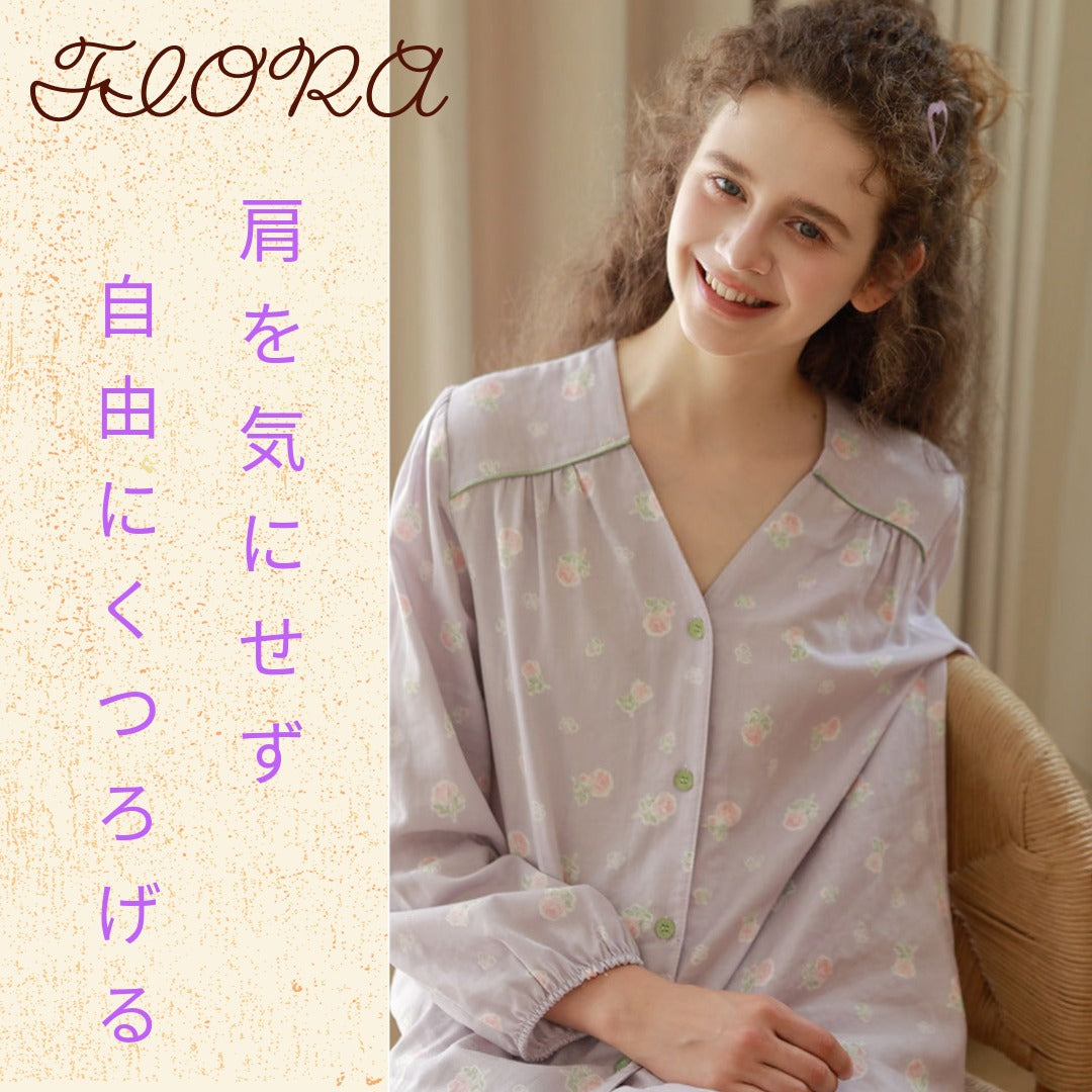 WダブルガーゼW【日本製】2025新作 フェミニンローズ 2色 長袖 長ズボン V開き 襟なし パジャマ ルームウェア