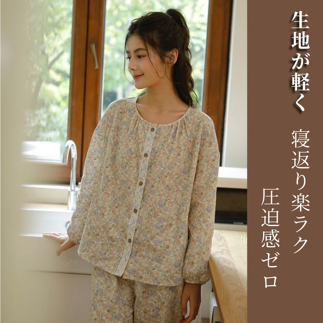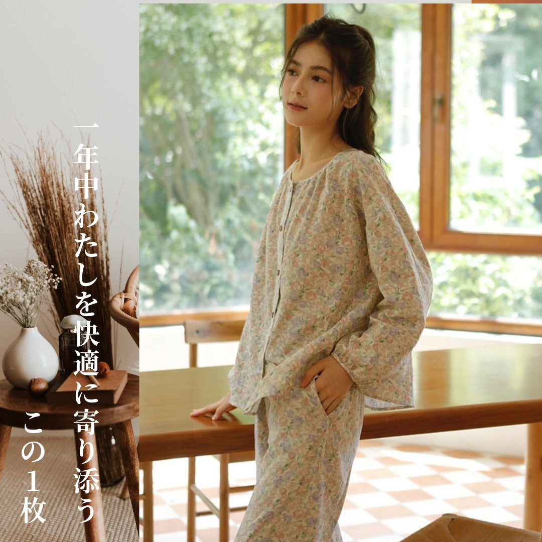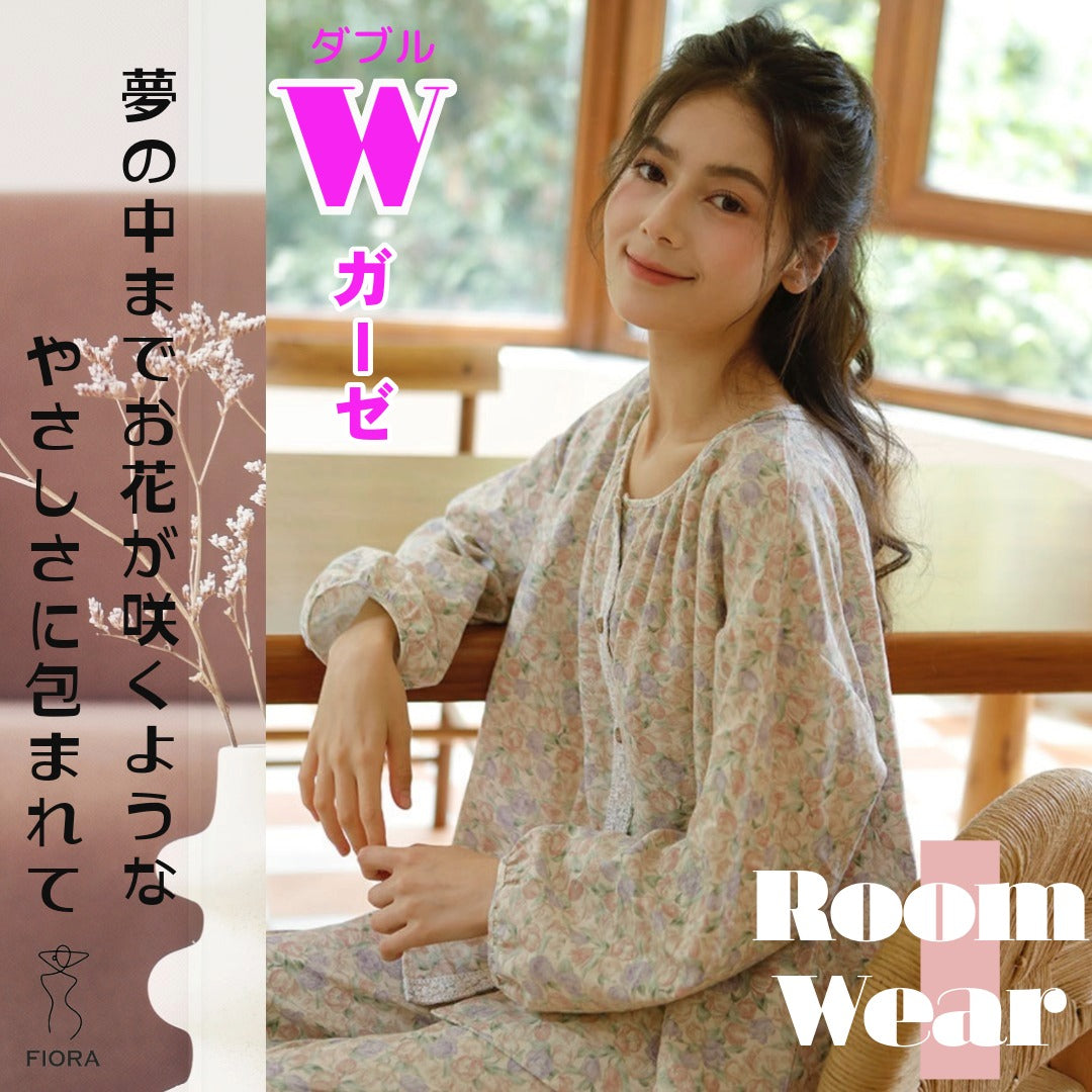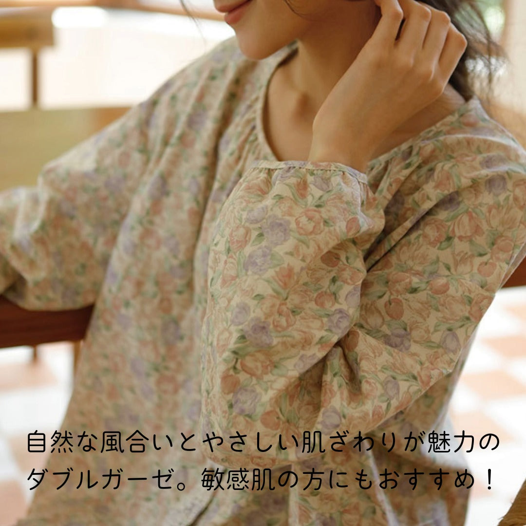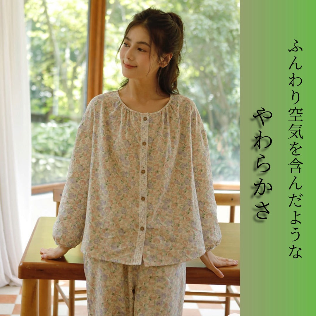 WダブルガーゼW【日本製】12月新作 スイートピー 襟なし 長袖 長ズボン パジャマ ルームウェア