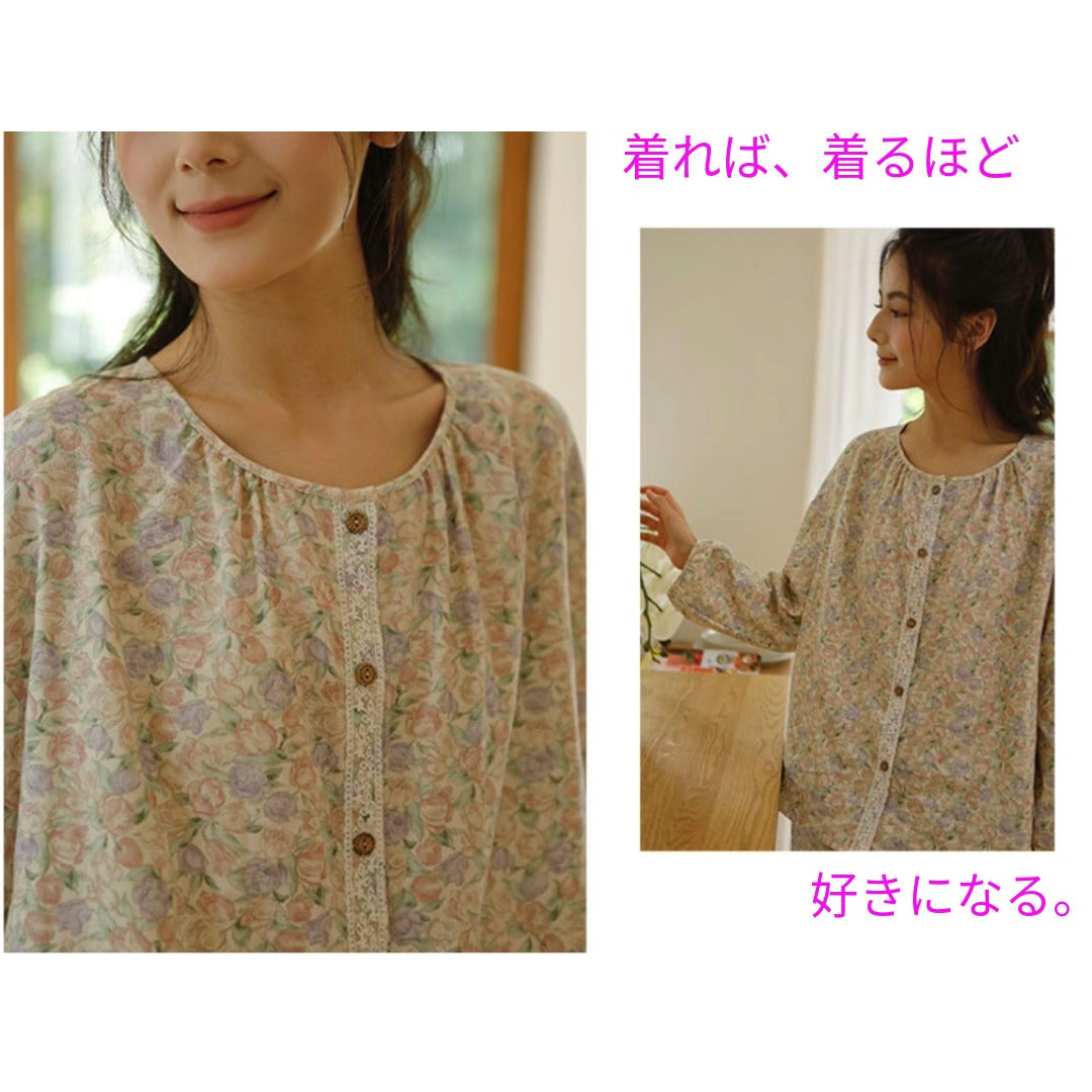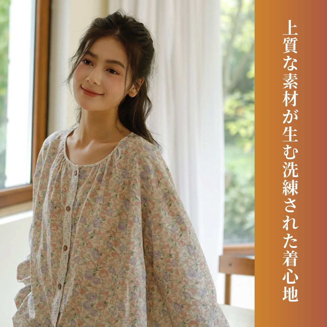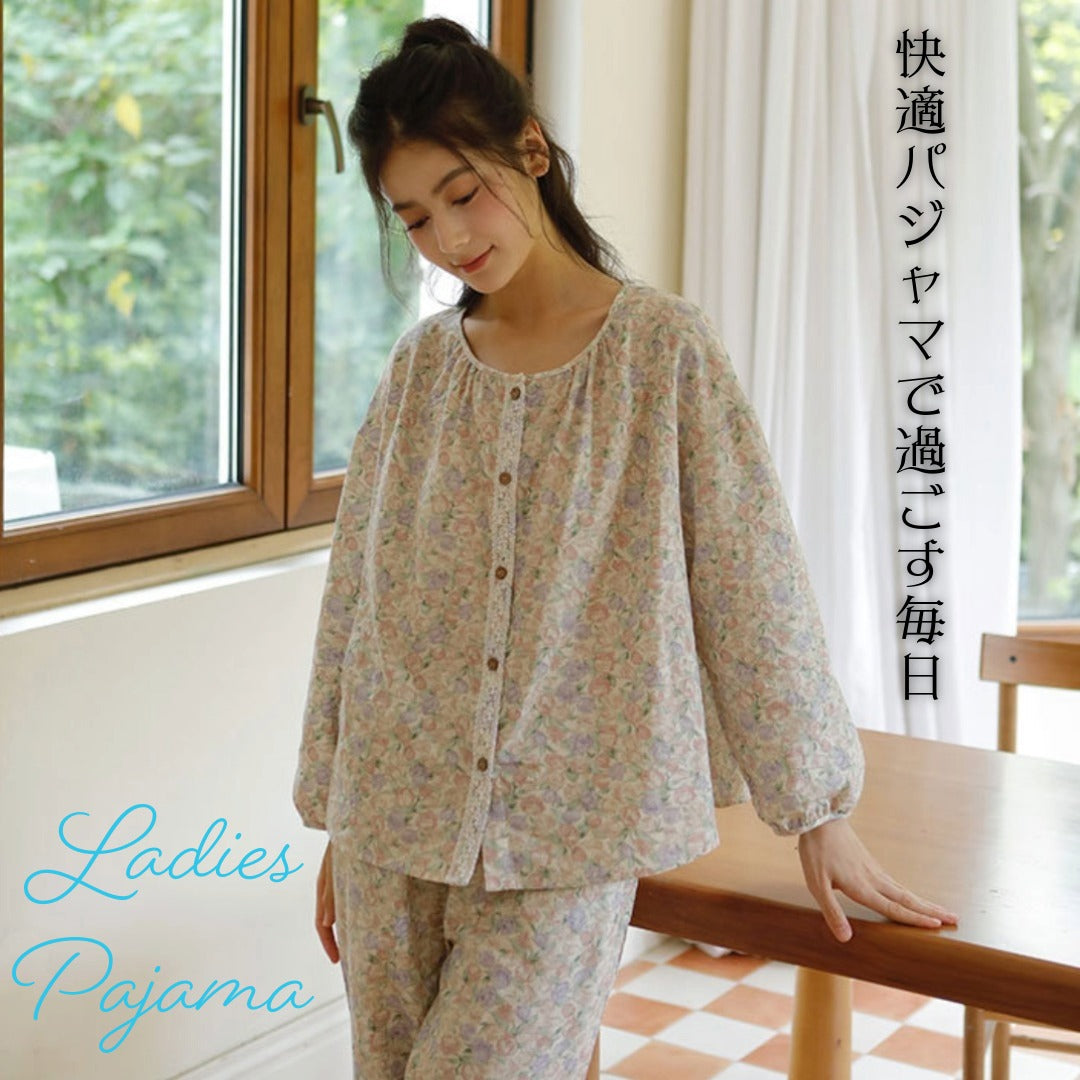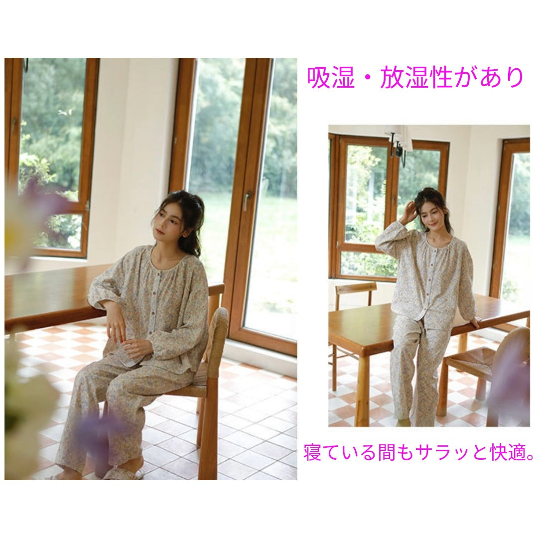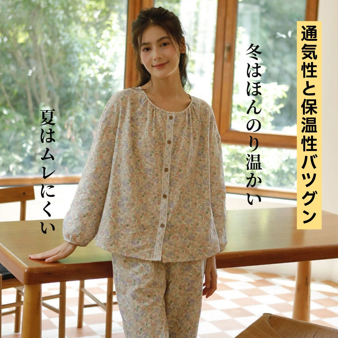 WダブルガーゼW【日本製】12月新作 スイートピー 襟なし 長袖 長ズボン パジャマ ルームウェア